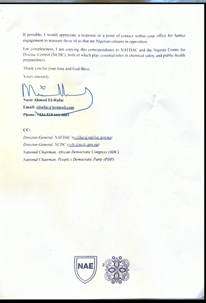 “I am writing as a concerned citizen to seek clarification and reassurance regarding information available to the political opposition leadership about a procurement of approximately 10 kilograms of Thallium Sulphate by the Office of the National Security Adviser (ONSA), reportedly from a supplier in Poland,” parts of the letter read.