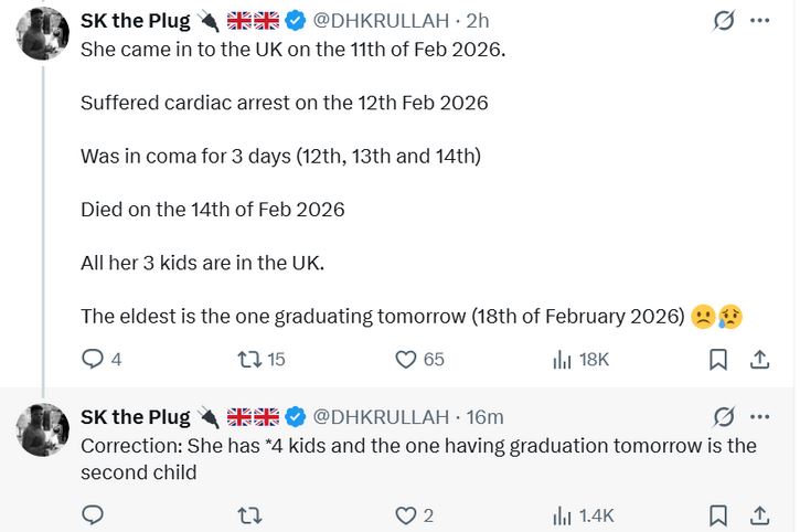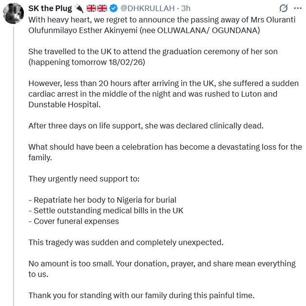 According to the post, Mrs. Akinyemi traveled to the UK on February 11, 2026, in anticipation of her child’s graduation ceremony, which was scheduled for February 18.