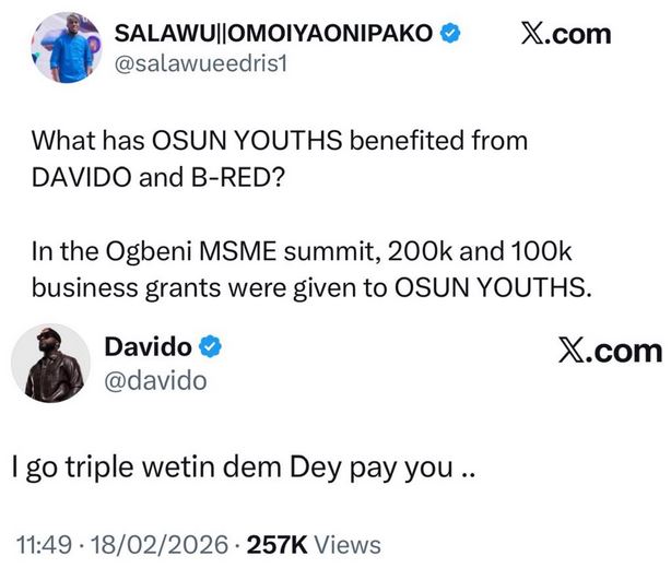 Nigerian singer David Adeleke, popularly known as Davido, engaged in a fiery exchange on social media on Wednesday afternoon after an X-user questioned his contributions to youth development in his home state.
