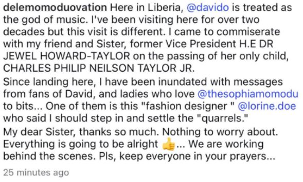 "Since landing here, I have been inundated with messages from fans of David, and ladies who love @thesophiamomodu to bits... One of them is this "fashion designer " @lorine.doe who said I should step in and settle the "quarrels."