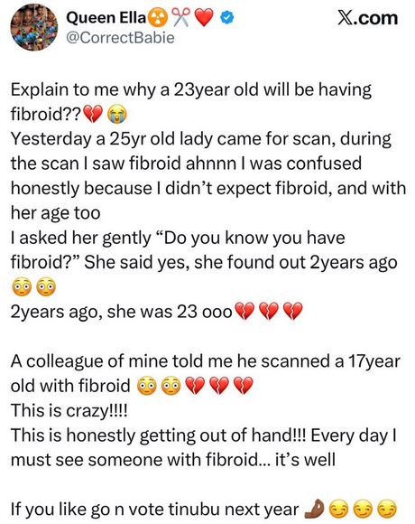 One of the X users mentioned that she recently met a 25 year old lady who already has Fibroid. She mentioned that the patient informed her that she got diagnosed with Fibroids when she was just 23.