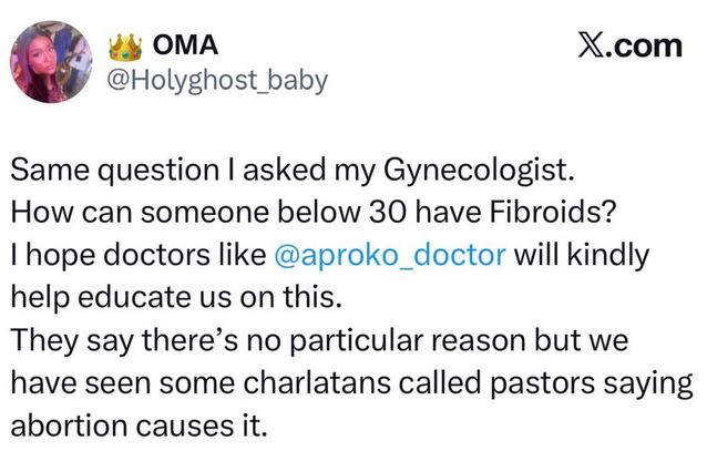 Another X user also wondered how women under 30 develop fibroid. The x user mentioned that some Charlatans who pose as pastors have claimed that the Fibroids only grow in women that have committe ab@rtions.