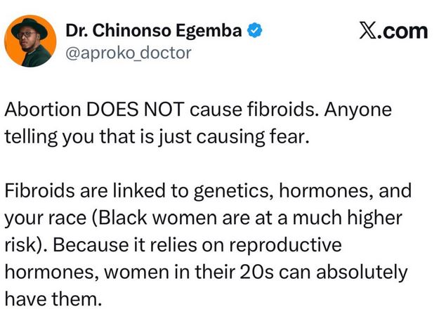 Popular online health advocate Aproko Doctor has dismissed claims that women who undergo abortions are highly prone to developing fibroids.