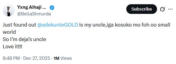 In his words, “Just found out adekunleGOLD is my uncle, Iga Kosoko mo foh oo small world