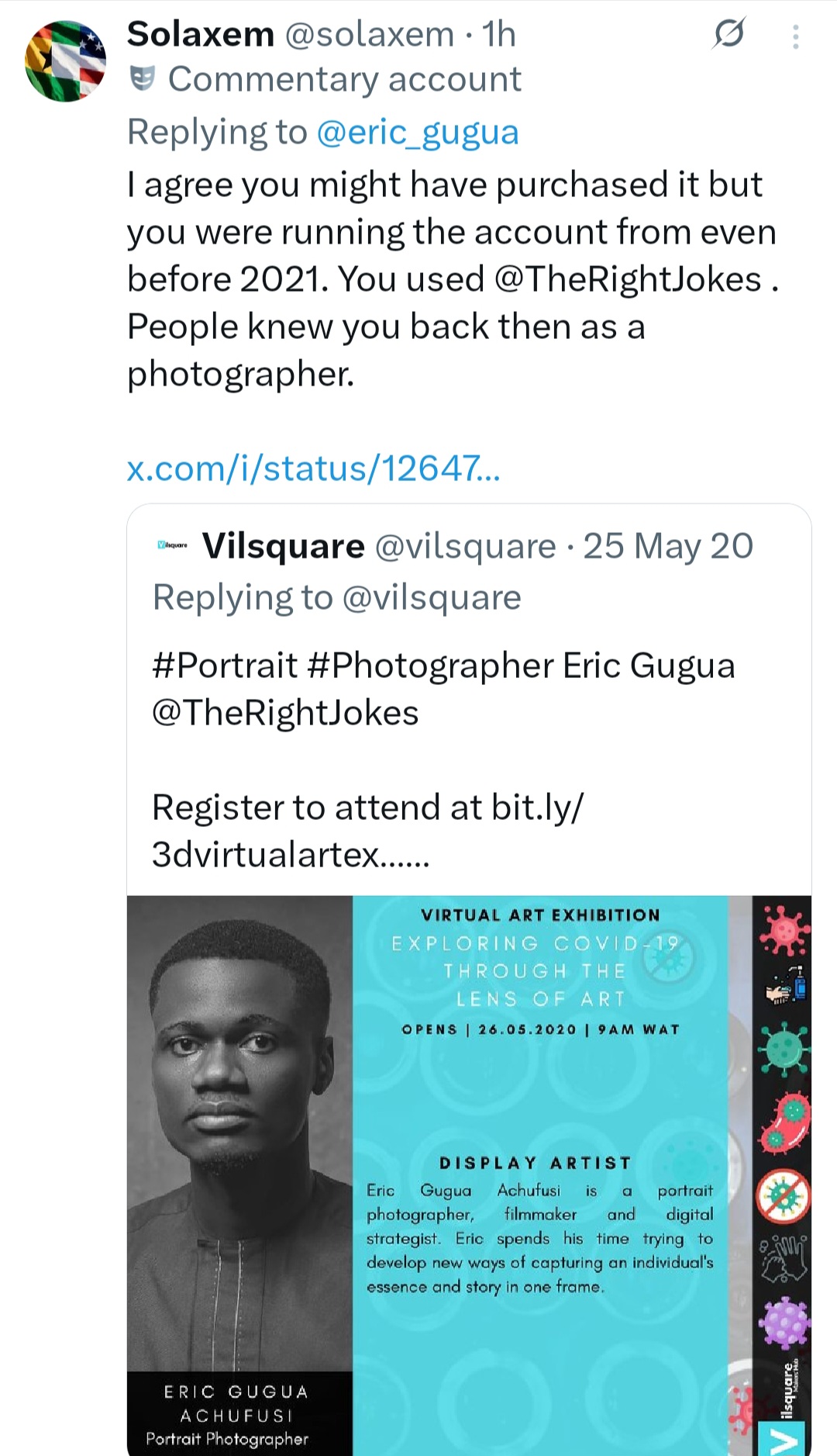 However, a follower brought up an old tweet with Eric's picture shared from the account in 2020 to show that the content creator had been using the account since before 2021 and the username @TheRightJokes was the account name at the time, which also happens to be the username that shared the offensive tweet.