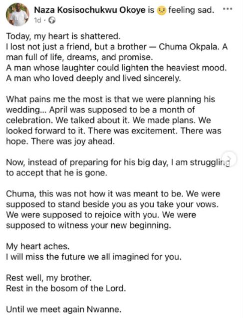 As condolences continue to pour in, the community remembers Hon. Chuma Okpala as a man whose life, though cut short, left a lasting impact on those around him. Further details are expected to be announced by the family in due course.