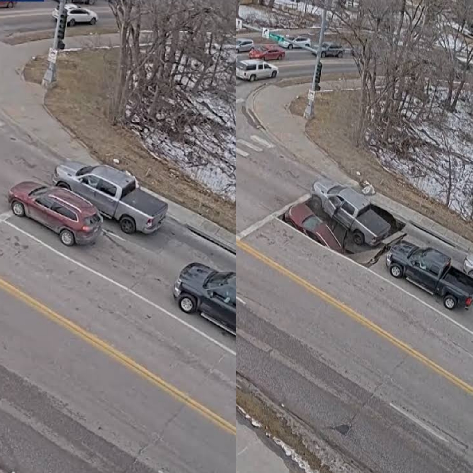 Surveillance footage captured the dramatic moment a section of the road gave way at a busy intersection in south-central Omaha, Nebraska, engulfing two vehicles.