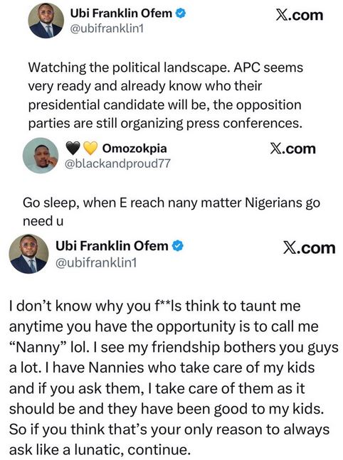 Music executive Ubi Franklin has fired back at a Twitter user who labeled him a “nanny” after he weighed in on Nigeria’s political landscape.