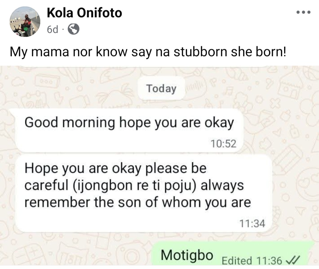 Just 5 days before he di£d in a lone accident while attempting his first interstate travel on his motorcycle, Kola shared a screenshot of his WhatsApp chat with his mother.