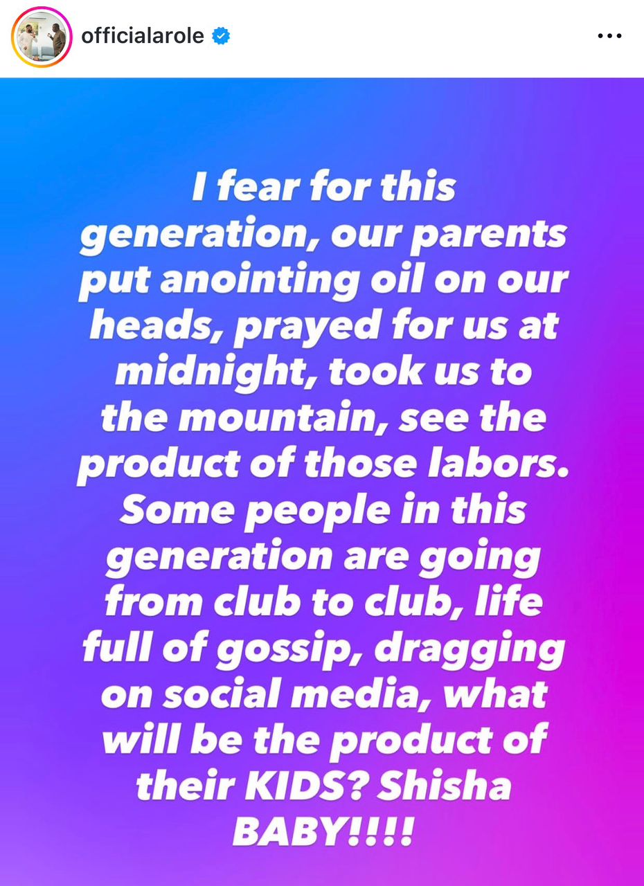 Reflecting on the potential impact of these behaviors, Arole wrote: "I fear for this generation. Our parents put anointing oil on our heads, prayed for us at midnight, took us to the mountain—see the product of those labors.
