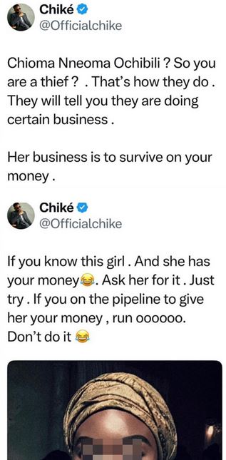 He wrote, “Chioma Nneoma Ochibili, so you are a thief? That’s how they do. They will tell you they are doing certain business. Her business is to survive on your money.
