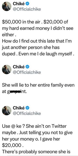 In a series of posts on X Monday morning, Chike claimed that he gave Chioma $20,000 for a business but she didn’t meet her own end of the bargain.