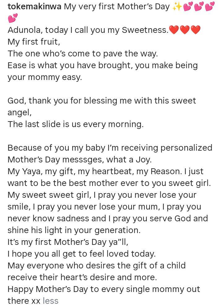 "My very first Mother’s Day. Adunola, today I call you my Sweetness,” she wrote.