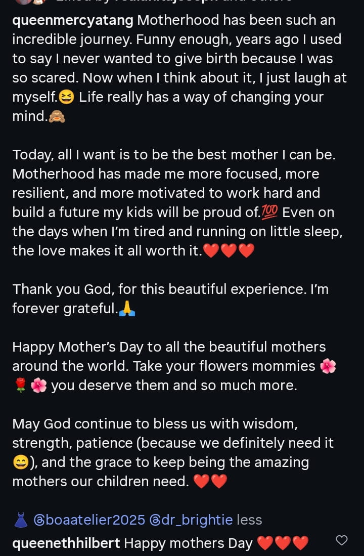 “Motherhood has been such an incredible journey,” Queen Mercy shared. “Funny enough, years ago, I used to say I never wanted to give birth because I was so scared.