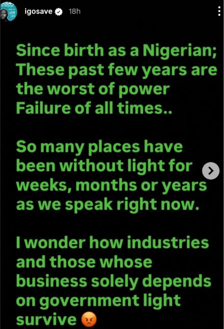“Since birth as a Nigerian, these past few years are the worst of power failure of all times,” he wrote, underscoring the severity of the situation.