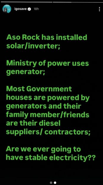 The comedian also drew attention to what he perceives as a stark contrast between the living conditions of ordinary Nigerians and those in government circles. He pointed out that key government facilities, including Aso Rock, have adopted alternative power solutions such as solar systems and inverters. Meanwhile, he claimed that ministries and government residences often rely on generators—sometimes supplied or contracted by associates of those in power.