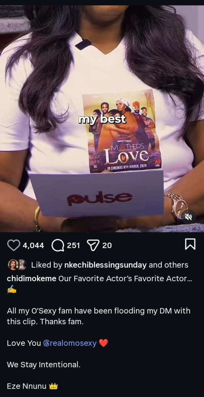 Responding to the viral moment, Chidi took to his Instagram page to express his appreciation. The actor shared that his direct messages had been flooded with clips and messages from Omotola’s fanbase, fondly known as the “O’Sexy” family, all celebrating the moment.