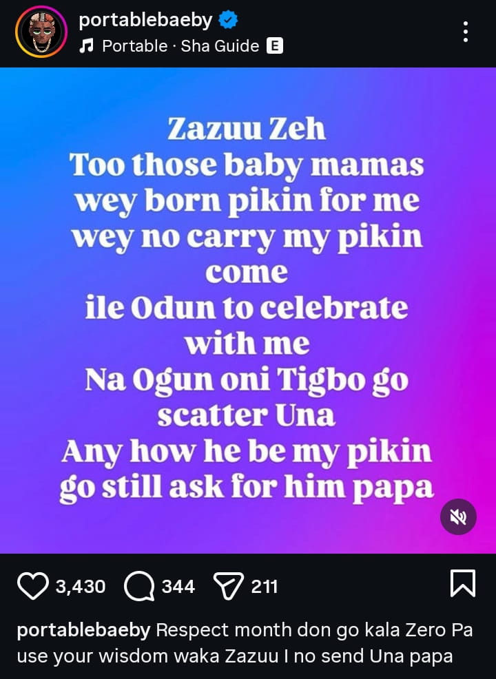 Controversial Nigerian singer Portable has stirred reactions online after calling out his baby mamas for allegedly preventing him from spending time with his children during the Eid al-Fitr celebrations.