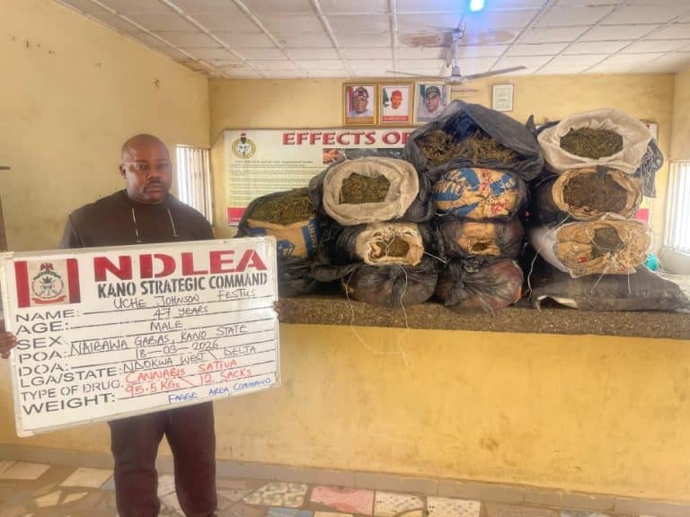In Kano, a 35-year-old suspect, Abdulkadir Mamuda, was arrested with 102.5kg of skunk at Dan-Tsalle, while another suspect, Uche Johnson Festus, 47, was nabbed on the same day at Naibawa Gabas, with 95.5kg of the same psychoactive substance.