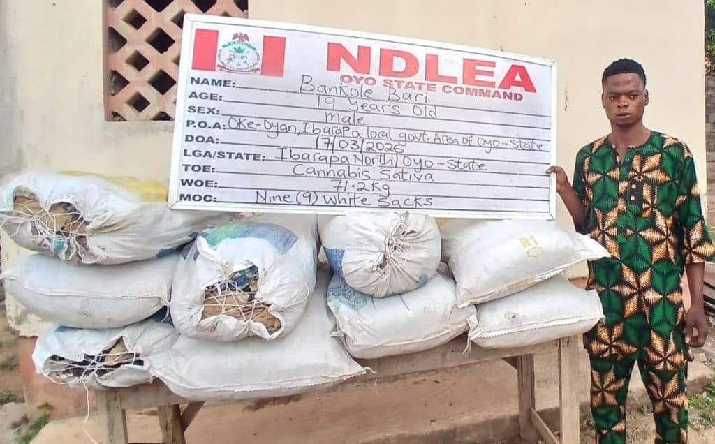 In Oyo state, a suspect, Bankole Bari, was arrested on Tuesday, 17th March, at Oke-Oyan, Ibarapa LGA, with 71.2kg of skunk, which he smuggled into Nigeria from the Benin Republic through the Oyan river.