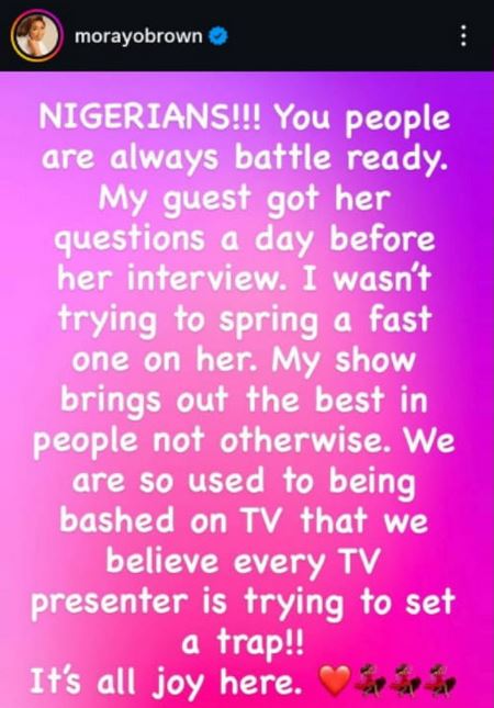 Explaining herself, Morayo said Nigerians are always battle-ready. She revealed that Ireti got her questions a day before her interview, and she wasn’t trying to fast one on her.