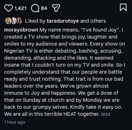 Nigerian media personality Morayo Afolabi has responded to the backlash she received after her interview with actress Ireti Doyle.