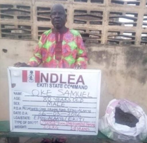 In Ekiti State, the statement added that “an 80-year-old grandpa, Oke Samuel, was on Thursday 26th March arrested by NDLEA operatives during a special raid operation at Mosafuneto camp, Erinmo road, Efon-Alaaye Ekiti. A total of 2.2kg skunk and 1.8grams of methamphetamine were recovered from him.”