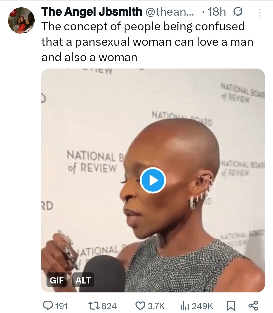 She wrote on X: "The concept of people being confused that a pansexual woman can love a man and also a woman."