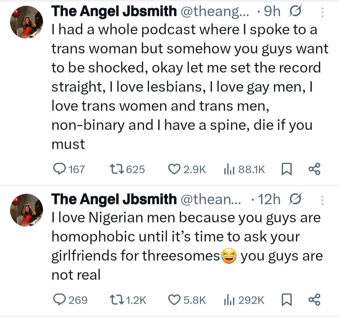 She wrote: "I love Nigerian men because you guys are homophobic until it’s time to ask your girlfriends for thr£esomes. you guys are not real."