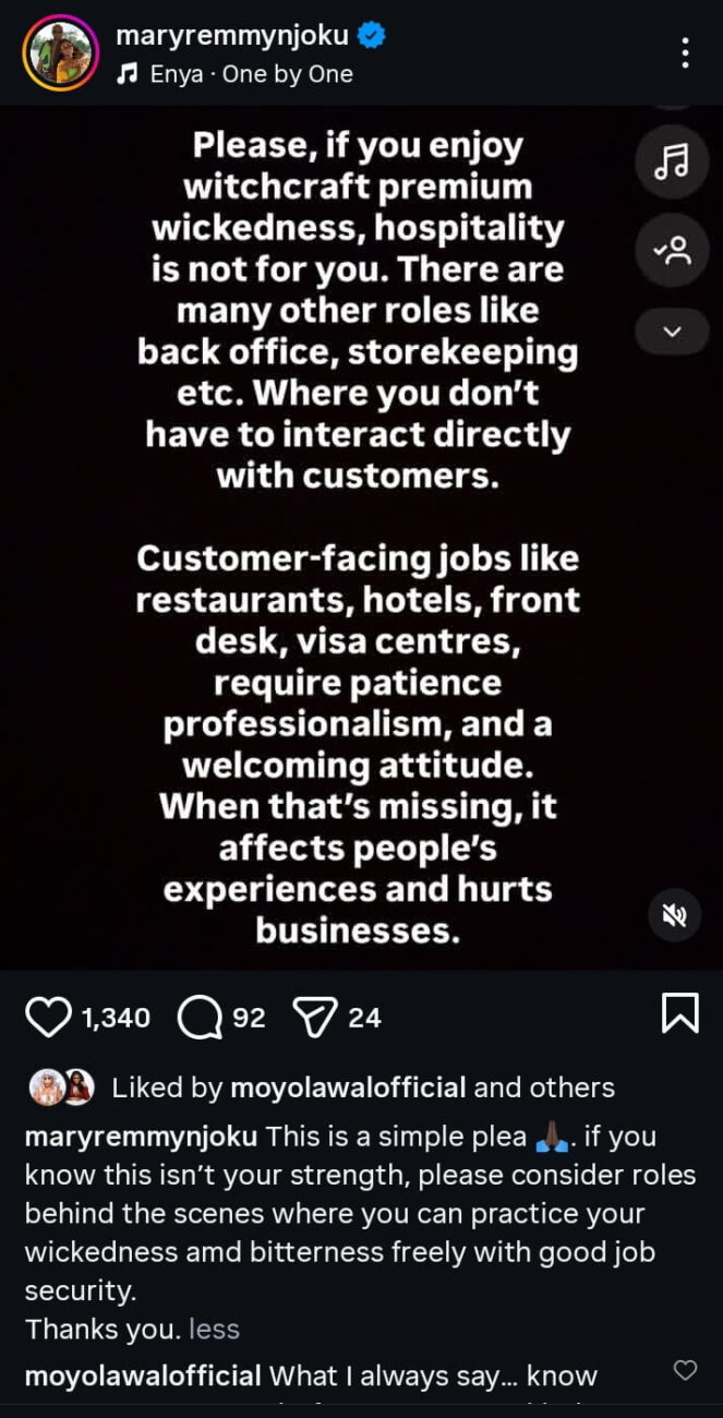 Mary Njoku’s message has resonated with many of her followers, sparking discussions on the importance of temperament, professionalism, and the often-overlooked challenges of working in hospitality.