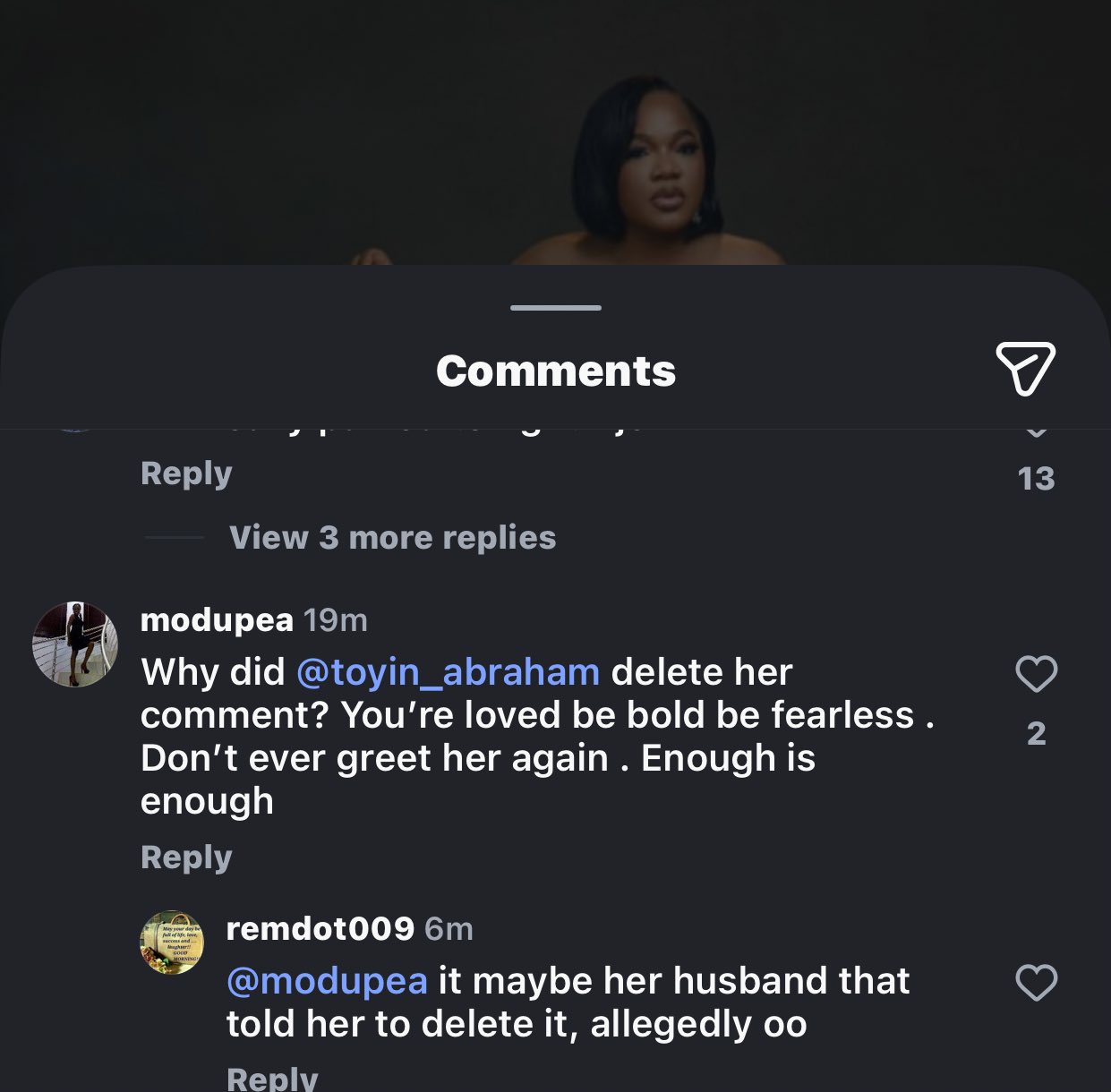 Toyin's husband has now publicly thanked her for listening to him and choosing not to speak.