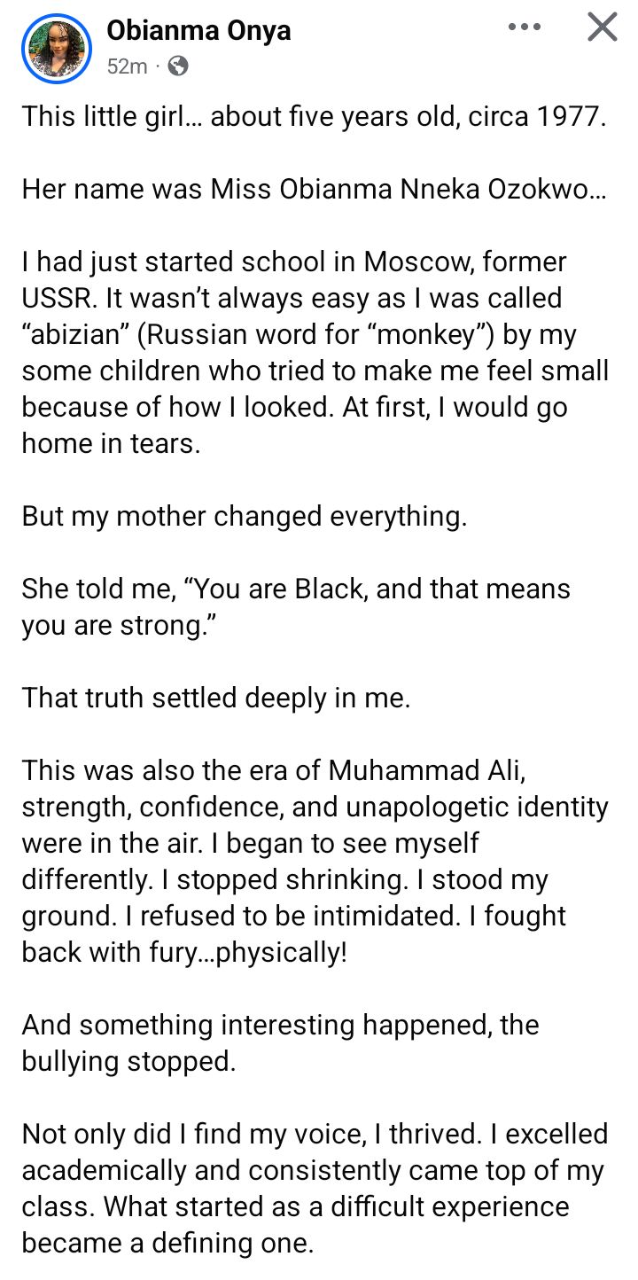 Nigerian doctor Obianma Onya has shared her harrowing childhood experiences with racism while living in Russia, then part of the former USSR.