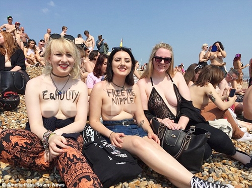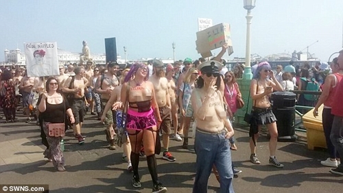 Two hundred women and men were paraded topless around Brighton Beach in the United Kingdom at the weekend for the 'Free the Nipple' campaign to make the sight or breasts more normal and to highlight controversial social media policies about banning female nipples.