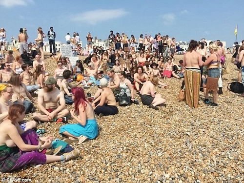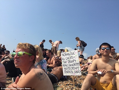 Hundreds of men and women at the 'Free the Nipple' protest on one of Britain's most popular beaches