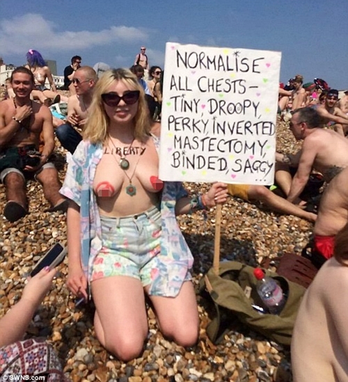Hundreds of men and women have gone topless to stage a protest on one of Britain's most popular beaches to 'Free the Nipple' and make baring boobs more acceptable in society.