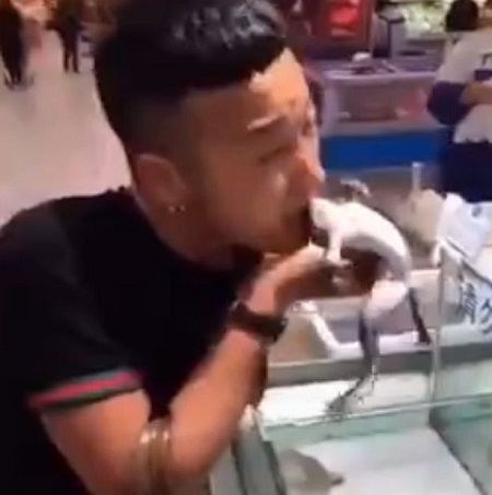 The man appears to be standing in the middle of a fish market when he picks up the huge amphibian and immediately shoves its head in his mouth.