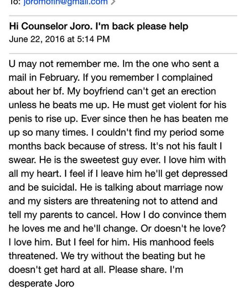 Joro Olumofin has shared the story of a lady who is constantly being beaten by her boyfriend for an erection to occur. All other means to ensure successful s*x has failed and the woman in question is ready to marry him despite the problem.