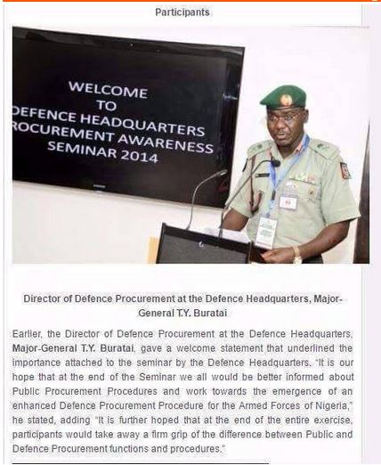 Colonel Usman also claimed that General Buratai had always declared the two properties as parts of his assets. But such claims are hardly cast-iron proof of fidelity to the laws on declaration of assets. Public officials regularly claim to own assets they have not bought. Similarly, Colonel Usman claimed that General Buratai was never a Director of Procurement at the Defense Headquarters. Yet, evidence from the website of Bureau of Public Procurement (BPP) proves the military spokesman wrong. According to the site bpp.gov.ng, General Buratai attended the 2014 Defense Headquarters Procurement Seminar as the Director of Procurement.