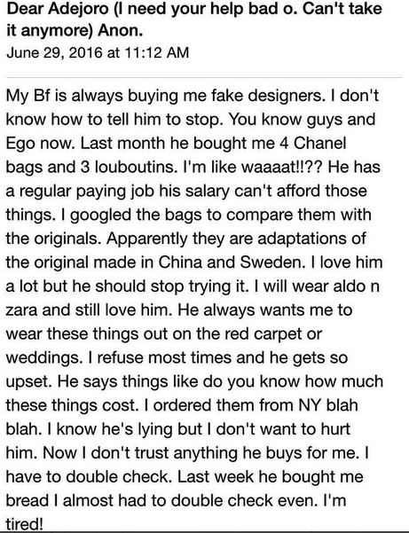 A lady has complained bitterly about her boyfriend's failed efforts to impress her due to his purchase of fake products which he lies about. She wrote to Joro Olumofin and the response from his followers on Instagram have been against her.