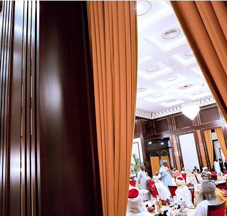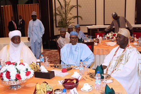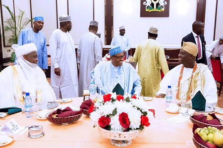President Muhammadu Buhari on Wednesday, 29th June, 2016, hosted the Ooni of Ife Oba Adeyeye Enitan Ogunwusi, Sultan of Sokoto Muhammad Sa'ad Abubakar, Emir of Kano Muhammad Sanusi II and other members of the National Council of Traditional Rulers of Nigeria to breaking of Ramadan Fast at the state house, Abuja.