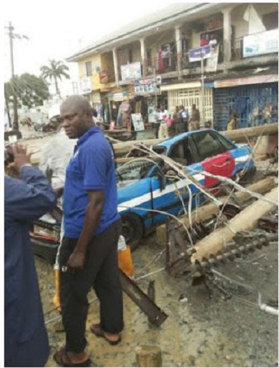 According to eyewitnesses, the electric pole fell on the car after a heavy downpour at Morther Cat junction, Port Harcourt,