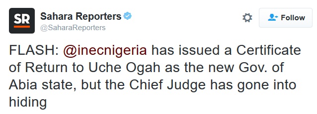 In a Tweet by SaharaReporters and a further announcement on Channels Television, the election ruling body in the country, INEC, has issued the Certificate of Return to Uche Ogah.