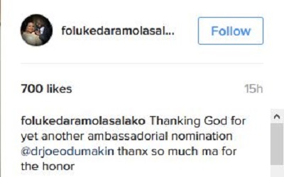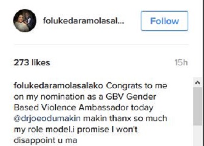 "Congrats to me on my nomination as a GBV, Gender Based Violence Ambassador today @drjoeodumakin makin thanx so much my role model. I promise I won't disappoint you ma."