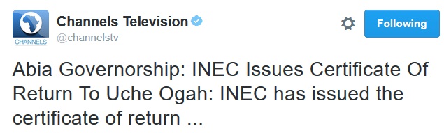 The Independent National Electoral Commission (INEC) few hours ago, issued a certificate of return to Uche Ogah as the new governor of Abia State.