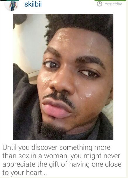 Five star music act, Skiibii took to his social media page to pour out his emotions with a sweaty and tearful photo. The youngster talked about appreciating a lady in his caption, making many of his fans to believe that he has been ditched by a girl.