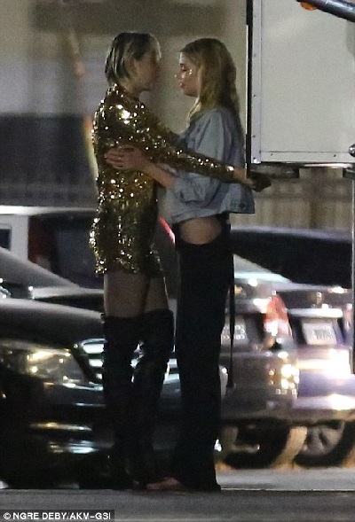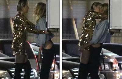 Controversial popstar, Miley Cyrus has been spotted passionately kissing her blonde Victoria's Secret Angel, Stella Maxwell. In new pictures which has already gone viral online, Miley, who recently came out as bisexual, can be seen locking lips with her 24-year old model girlfriend during a break from filming her new music video in Hollywood.