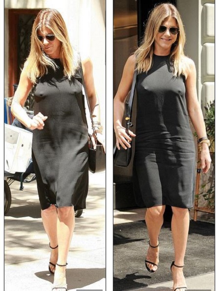 47-year-old super actress, Jennifer Aniston showed off her incredible body in a black ensemble on Thursday. The actress opted to go without a bra in an understated flowing dress in Manhattan which showed off her thick nipples.