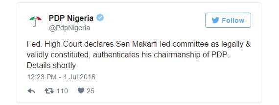 On Monday, July4, 2016, a Federal High Court sitting in Port Harcourt, Rivers state on declared Senator Ahmed Makarfi as the authentic national chairman of the Peoples Democratic Party (PDP).