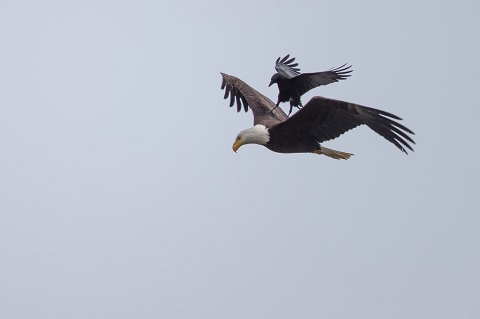 “At first I thought the crow was going to chase away the eagle,” Chan told Daily Mail. “I have seen crows harassing a hawk by swooping back and forth in order to drive it away from their territory. I was completely awed to see the crow actually land on the back of the flying eagle.