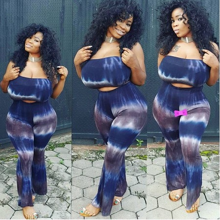 A Lagos girl based in the Magodo area simply identified as Romangoddess has flaunted her gigantic endowments with in an overall Kampala outfit.